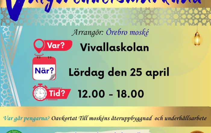 Årets andra Välgörenhetsmarknad. Nästa helg är det dags för årets andra välgörenhetsmarknad där intäkterna går oavkortat till nästa etapp av moskéns återbyggnad som avser det utvändiga jobbet. När: på lördagen den 25 april kl.12.00 i Vivallaskolan. Var med och få del av belöningen. Varmt välkomna!