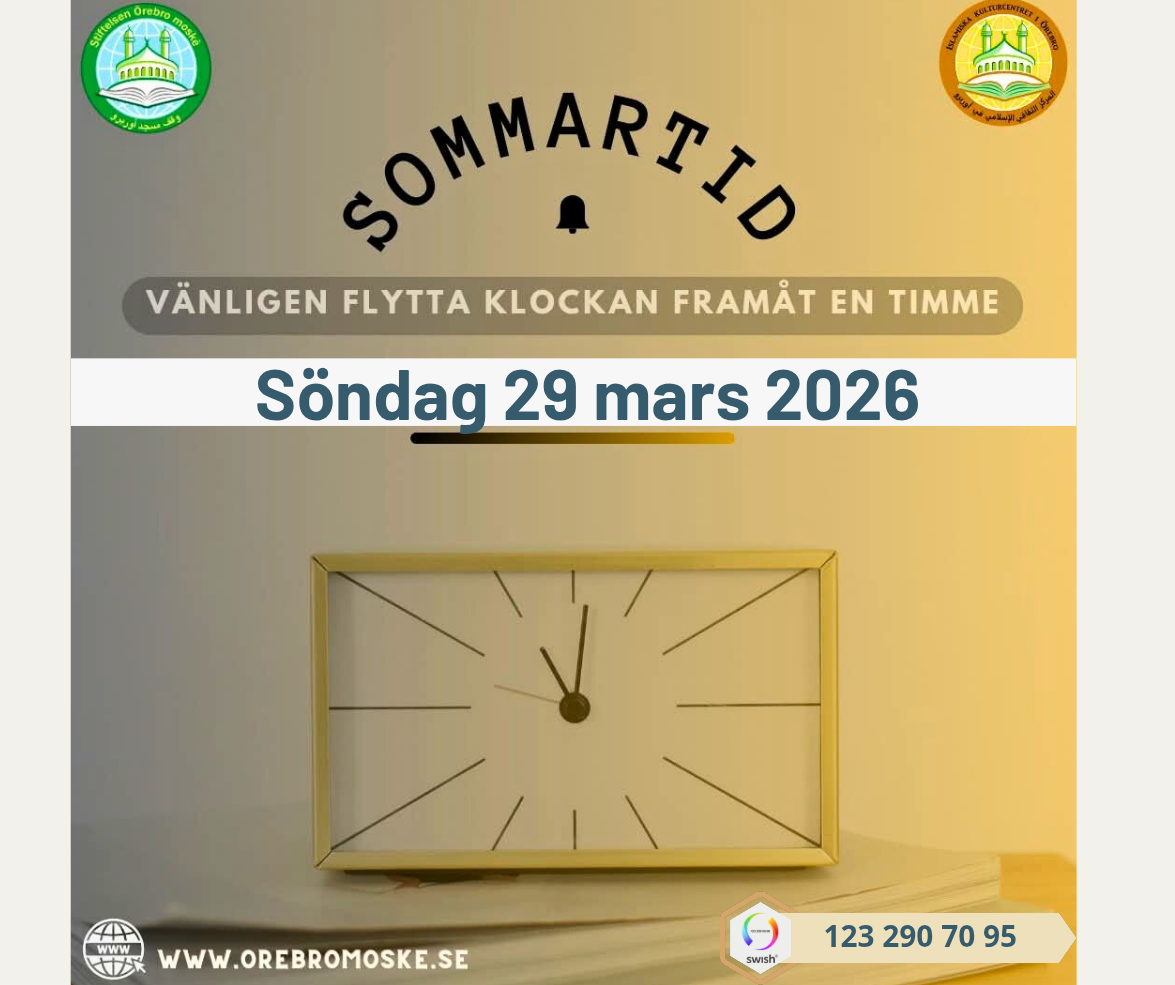 2026-04-17T21:20:28+02:00VIKTIG INFO GÄLLANDE BÖNETIDERNA! "Han låter natten glida in i dagen och Han låter dagen glida in i natten. Han har underordnat solen och månen i Sina lagar: Var och en löper sitt kretslopp till en fastställd tidpunkt. Koranen [kap:35 vers:12] Pga. avsaknaden av teckenen på Isha och fajr från slutet av april till mitten av augusti så har våra lärda i moskén bestämt följande baserat på fatawa från framstående lärda. För att göra saker och ting lättare för människor och för att undanröja svårigheter: 1 - Iqama för fajrbönen utförs (60) minuter efter Fajrbönens tidpunkt enligt det nuvarande tidtabellen idag. 2- Isha-bönen utförs (60) minuter efter Maghrib-bönen med startar på lördag den 18/4 3- Den som vill fasta bör hålla upp för mat och dryck från den faktiska tiden för fajrbönen enligt tabellen. 4 - Denna uppskattning kommer att vara giltig fram tills tecknen klarnar upp i mitten augusti. 5 - Vetenskapliga rådet i moskén uppmanar till att följa ovanstående rekommendationer för att ena ordet och avvärja splittring. Må Allah Allah välsigna er! Dela gärna vidare!